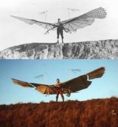 Oben: Lilienthal 1884 - Kleiner Schlagflügelapparat, Unten: Nachbau 1988 - Kleiner Schlagflügelapparat
